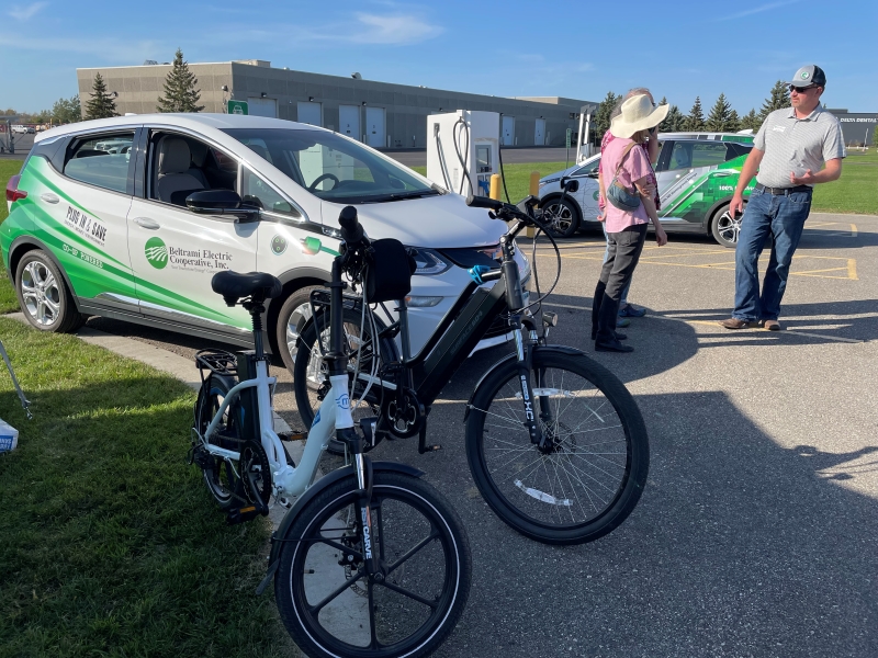 On Tuesday, Sept. 28, Beltrami Electric Cooperative invited the public to a Ride-and-Drive Electric Vehicle Event that featured a fast-charging demonstration, off-peak charging incentive information and lots of take-home goodies. Three EVs were displayed from cooperatives and utilities, but nearly 10 more came from owners around the area, who rolled into the lot with Teslas, Mustang Mach-Es, Chevy Bolts and more. But the technology didn’t stop at cars – electric bikes and an all-electric Ranger were also on hand for the more than 50 people who stopped by for the experience, including Bemidji mayor Jorge Prince.